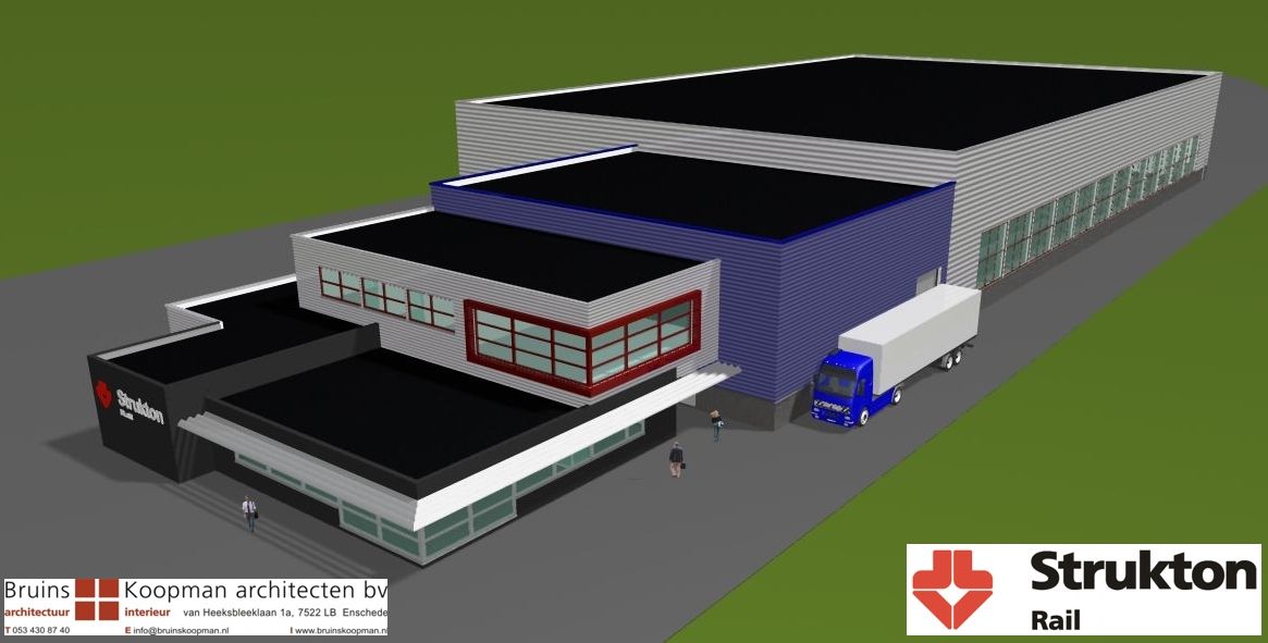 De eerste drie afbeeldingen tonen een artist impression van de nieuwe werkplaats Strukton Rail.
