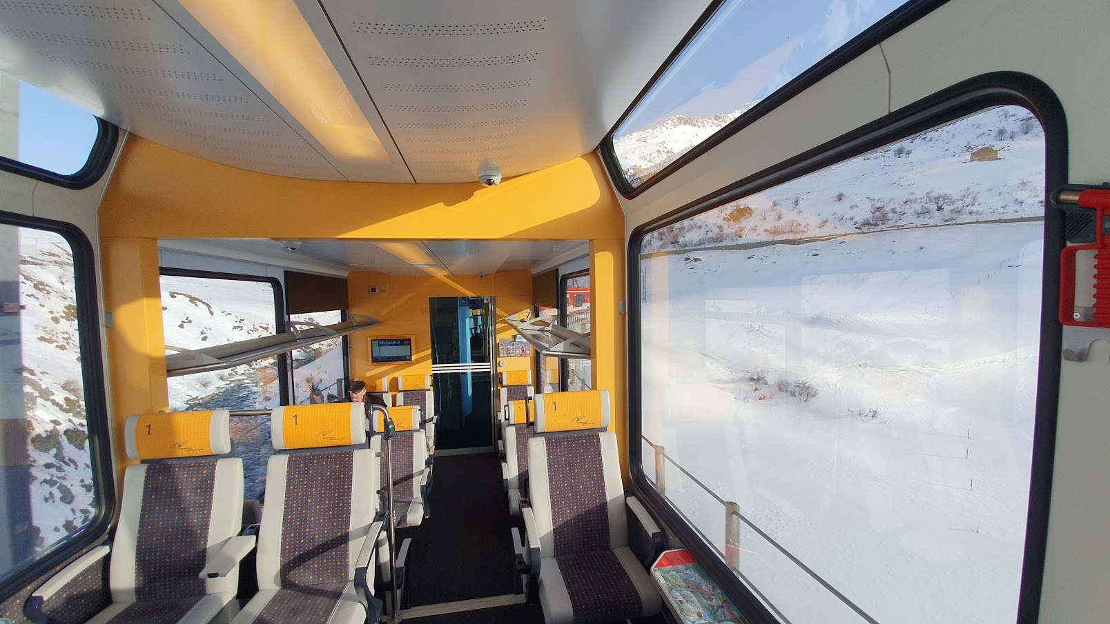 De regionale trein Brig – Andermatt tijdens het wintersportseizoen, 1e klas.