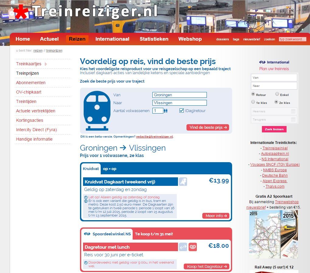 Treinreiziger.nl introduceert een prijsvergelijking voor treinkaartjes, waardoor het eenvoudig wordt om goedkope treinkaartjes te vinden. De website houdt niet alleen rekening met de gebruikelijke NS-tarieven, maar ook met dagkaarten die bijvoorbeeld via Hema, Kruidvat, Blokker of AH worden verkocht.