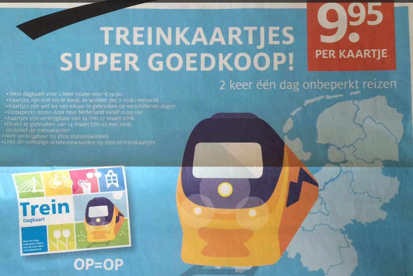 In de folder van ETOS staat het niet vermeld, maar de treinaanbieding is NIET geldig op 27 april. Dat bevestigt NS tegenover Treinreiziger.nl. Inmiddels heeft ETOS die voorwaarden ook online toegevoegd. Op Koningsdag willen al dusdanig veel mensen met de trein, dat acties niet te gebruiken zijn op deze dag. De treinreis moet plaats vinden voor of op 22 mei. Je kunt de NS-dagkaarten dus ook gebruiken voor een reisje in de mei-vakantie.
