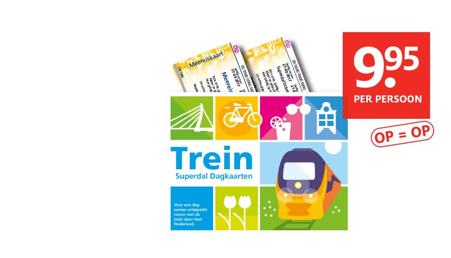 Binnenkort kun je bij ETOS weer goedkope treinkaartjes kopen! Het gaat om een Superdalticket: een treinkaartje voor twee personen voor 19,90 euro. Omgerekend dus 9,95 euro per persoon. De verkoop start op 2 oktober 2017. OP = OP