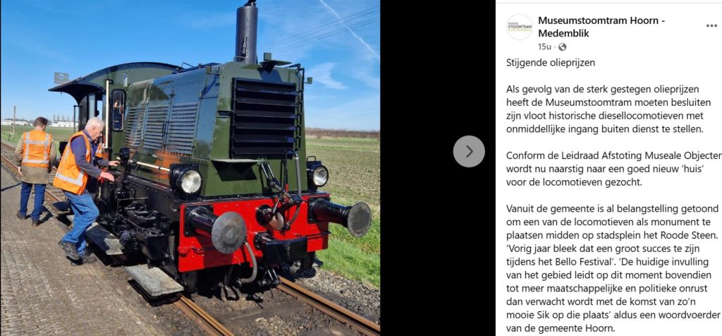 Museumstoomtram Hoorn – Enkhuizen kondigde aan vanwege de hoge brandstofprijzen de diesellocomotieven af te gaan stoten. De gemeente Hoorn zou al belangstelling hebben een locomotief als monument te plaatsen op stadsplein Roode Steen.