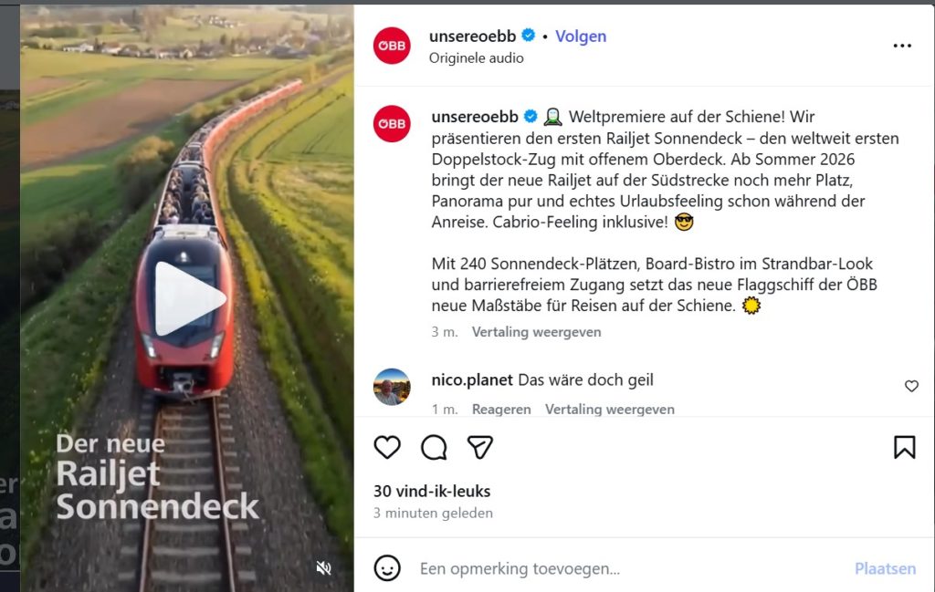In Oostenrijk hadden ze bij de ÖBB hetzelfde idee. Daar probeerde de treinmaatschappij het publiek wijs te maken dat er een Railjet komt met zonnedek.