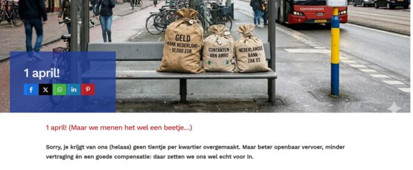 Het is vandaag 1 april, voor wie deze woensdag nog niet geconfronteerd is met een flauwe grap. Op de dag waar we niet zo zwaar tillen aan nepnieuws, zijn er ook weer een hoop organisaties uit de OV-sector die het publiek op het verkeerde been proberen te zetten. Hier een bloemlezing.