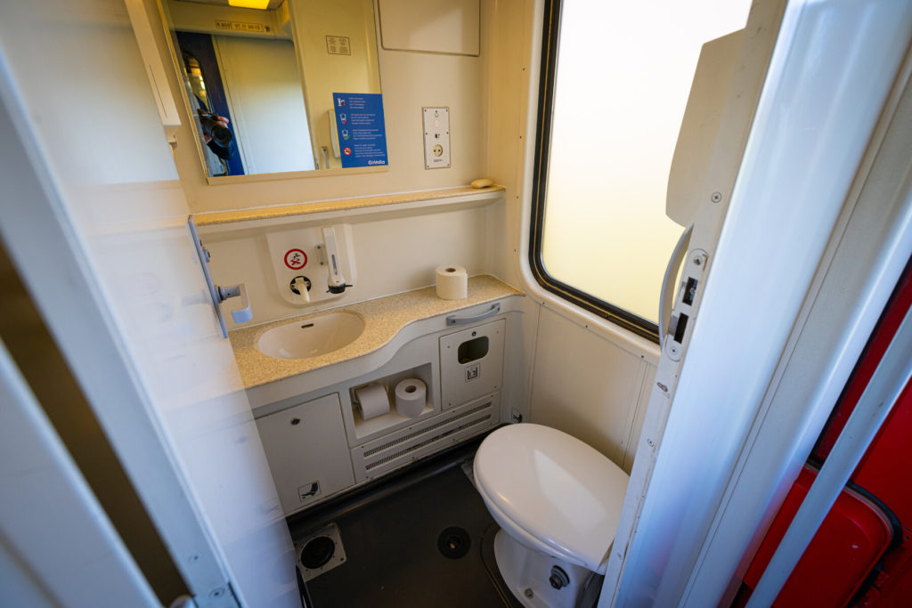 Stoelen zitten wel allemaal tegenover elkaar en niet een paar achter elkaar valt mij op. Nu moet je je beenruimte wel delen met je buurvrouw of buurman tegenover je en dat op zo’n lang traject, weet niet of het mijn ding is, maar dat zie ik ook bij de WESP waar ik in 99 % van de gevallen kiest voor de stoelen achter elkaar en die zijn er gelukkig wel voor meer privacy…