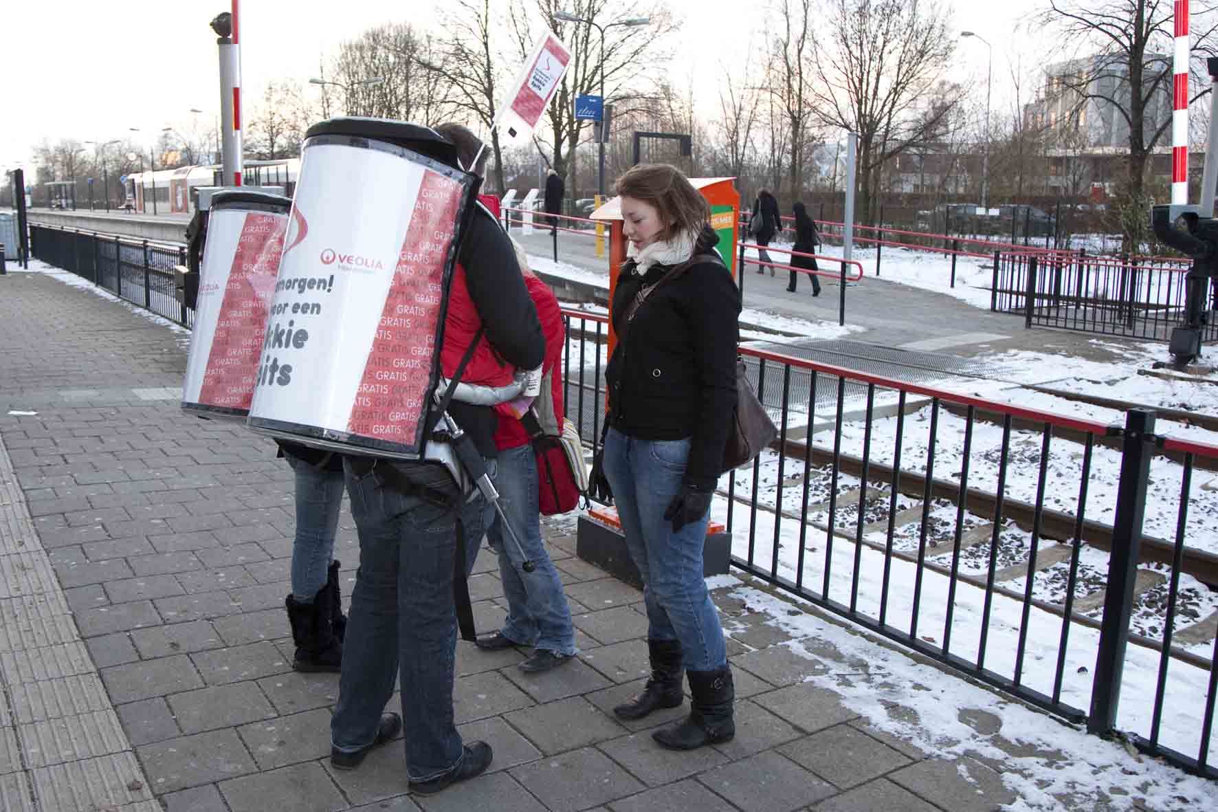 Met een team van ‘koffiedragers’ wordt er op de stations, wisselend per ochtend, koffie uitgedeeld in apart hiervoor gemaakte bekertjes. Dit team is te herkennen aan de uitingen die ze op de rugzak en als vlaggetje dragen. De reizigers kunnen allemaal bij dit team terecht voor een lekker (gratis) kopje koffie gedurende diverse dagen.