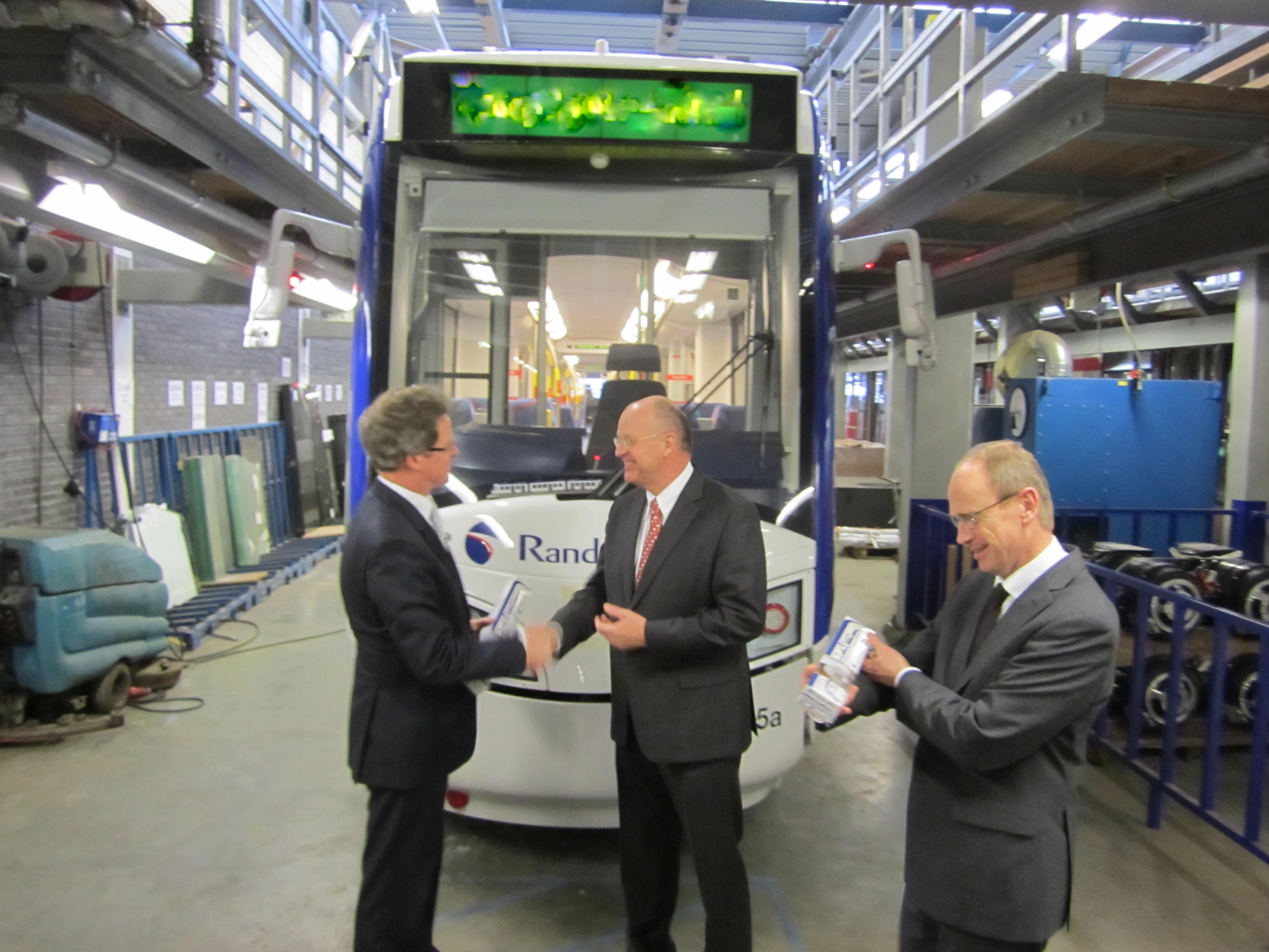 Léon Linders, Algemeen Directeur Alstom (L) overhandigt Dirk Le Clercq, Algemeen Directeur HTM een model van de Regio-Citadis terwijl Peter Smit (R), Wethouder Verkeer & Vervoer Den Haag zijn model vol aandacht bekijkt.
