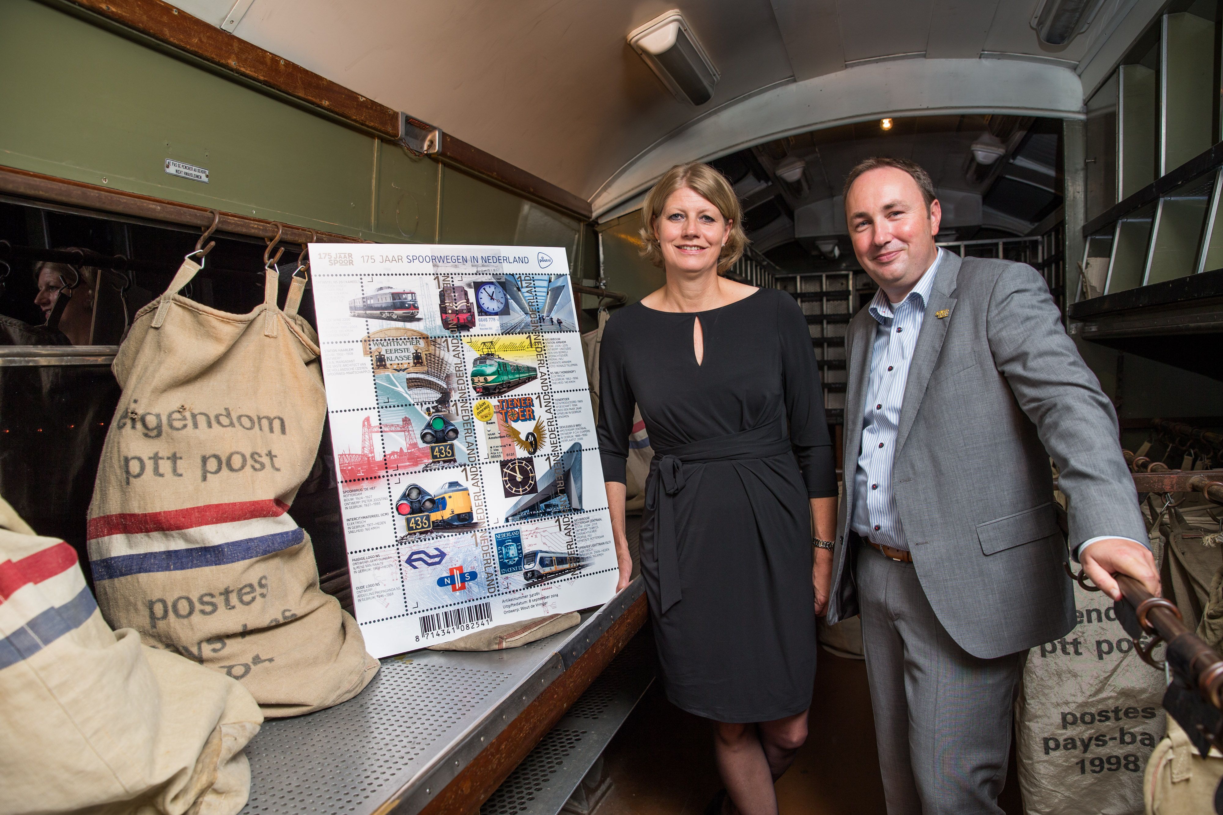 De eerste zegel werd overhandigd door Simone Bel, directeur Corporate Communicatie van PostNL aan Maurice Unck, directeur Communicatie en Strategie van NS.