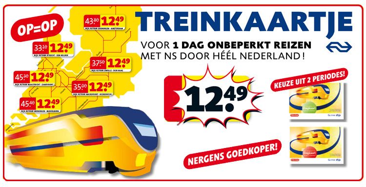 De actie met goedkope treinkaartjes van de Kruidvat begint weer! Voor 12,49 euro een zaterdag of zondag gratis reizen met alle reguliere reizigerstreinen door Nederland! Vanaf 5 oktober te koop in alle winkels van Kruidvat.