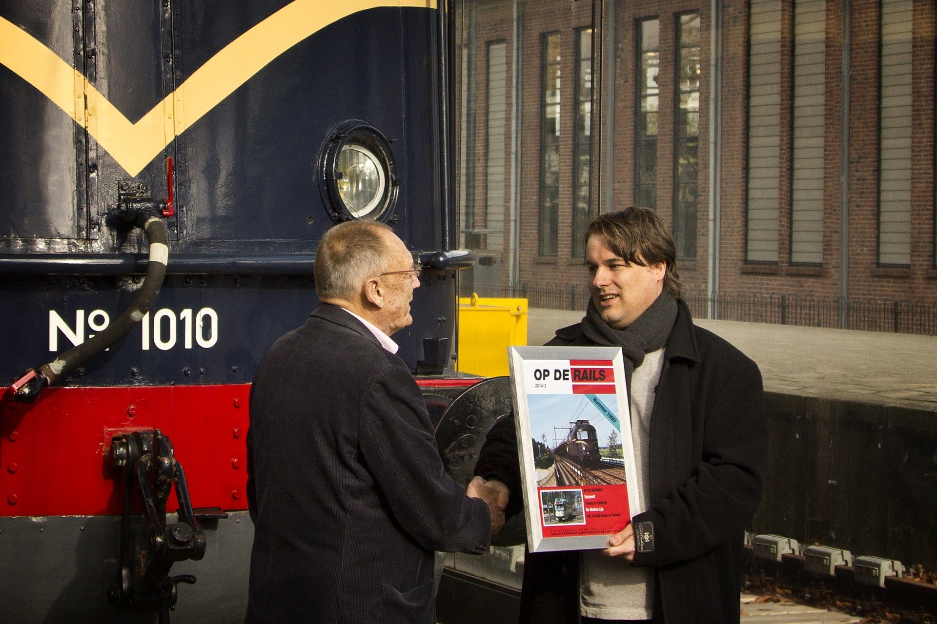 83 jaar geleden, in maart 1931, verscheen het NVBS-maandblad voor het eerst, toen nog onder de titel NVBS Orgaan. In februari 1947 verscheen voor het eerst de titel Op de Rails op het blad. Zaterdag overhandigde NVBS-voorzitter Maikel Rörik de duizendste Op de Rails aan oud-hoofdredacteur en erelid Frits van der Gragt. Frits van der Gragt was verantwoordelijk voor vele jaargangen Op de Rails en schreef talloze artikelen. Het decor voor de overhandiging was museumlocomotief 1010 van het Spoorwegmuseum. Die was speciaal hiervoor uitgekozen omdat dit locomotieftype onder liefhebbers bekend staat als ‘de duizend’. In het kader van dit bijzondere getal wordt in het maartnummer van Op de Rails aandacht geschonken aan treinen en trams die het nummer 1000 dragen.