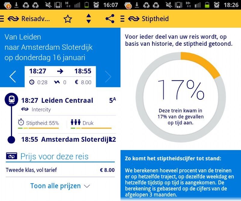 De stiptheid wordt getoond als er op de pijltjes wordt geklikt in de gele balk (het één na laatste symbol). De vernieuwde app is vanaf donderdag beschikbaar.
