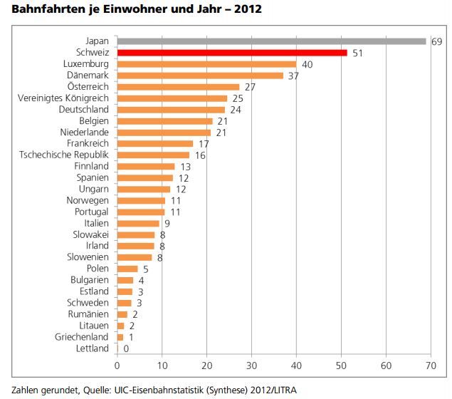 De lijst wordt aangevoerd door Zwitsers, die verreweg het meest in de trein stappen: gemiddeld 51 keer per jaar. Totaal leggen de Zwitsers gemiddeld 2274 kilometer per jaar af. De onderzoekers keken niet alleen naar Europese landen, maar ook naar Japan. Een Japanner stapt gemiddeld weliswaar nog vaker in de trein – zo´n 69 keer per jaar – maar maakt gemiddeld minder kilometers dan de Zwitsers (1912 kilometer).