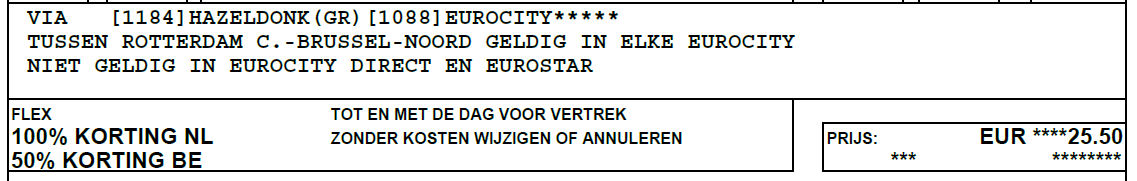 Maar het nieuwe tarief voor de Eurocity, omg… Hazeldonk-Brussel met 100% korting NL en 50% korting BE is nu 25.50 euro ipv 13 euro in 1e klas. Zonder korting dus 51 euro, voor minder dan 100 kilometer… Eurostarprijzen.