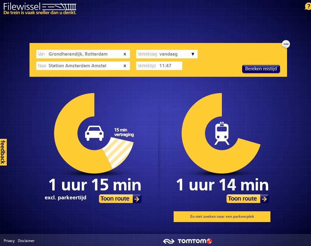 De site filewissel.nl moet na het invoeren van vertrek- en aankomstpunt twee tijden laten zien, de snelste autoreistijd en de snelste treinreistijd. Bij de berekeningen wordt rekening gehouden met files en vertragingen op het spoor.