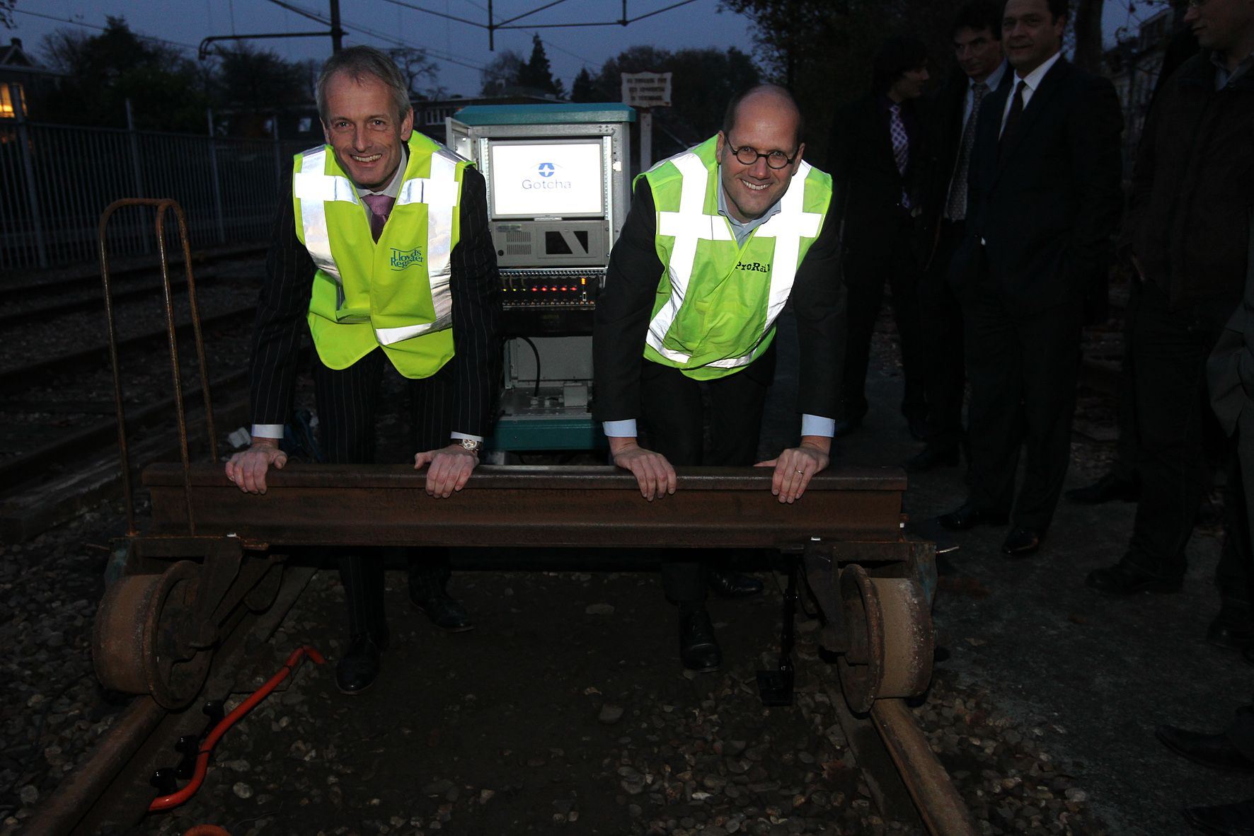 Foto: Peter-Paul de Winter, Hoofd Collecties van Het Spoorwegmuseum, rijdt samen met ProRail vertegenwoordiger Henk van Oostveen het eerste karretje over de Gotcha-sensoren. (c) Paul Ridderhof