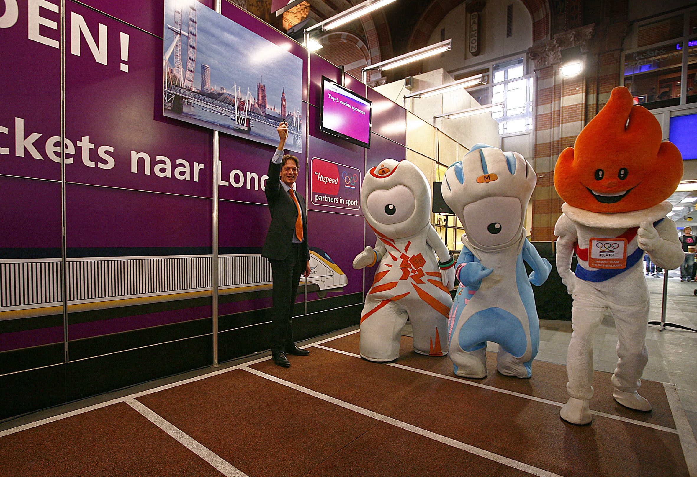 De officiële Olympische mascottes Wenlock en Mandeville gaven vandaag het startschot voor de voorverkoop van NS International-tickets naar de Olympische Spelen in Londen. In het Centraal Station van Amsterdam konden reizigers een sprintje trekken om in aanmerking te komen voor de eerste treintickets naar de Spelen van 2012.