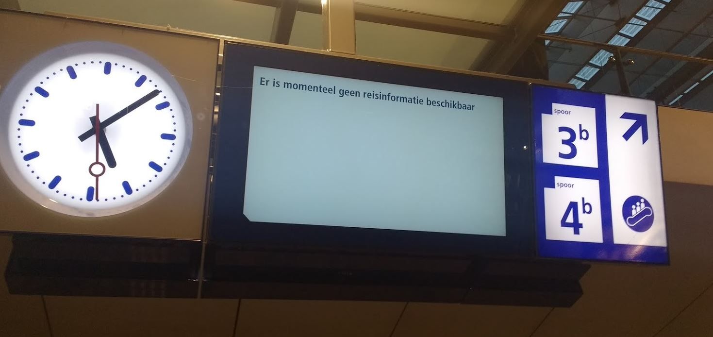 De digitale borden op de stations werken woensdag sinds 16:00 uur niet meer. Om 22:30 was de storing nog steeds niet verholpen. Door de storing kunnen treinreizigers niet op de digitale borden zien welke treinen bij de perrons staan.
