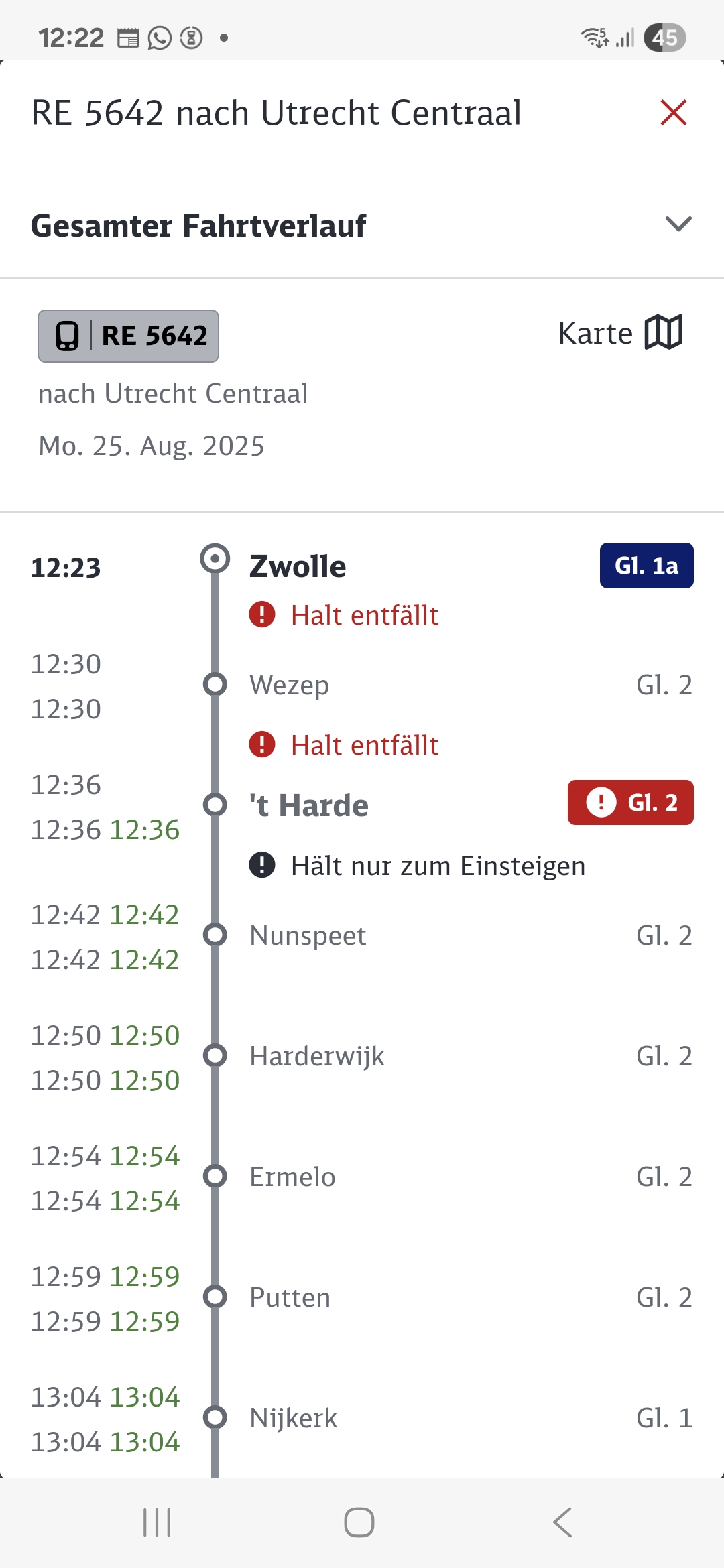 bahn.de doet het ook goed-althans hier in een sterk vertraagde RE1 van Nat.Express-maar geeft wel de ´normale´ situatie weer, dus niet die verstoring wegens koperweg bij Zwolle.