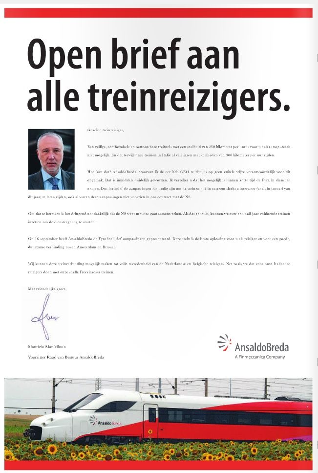 In een open brief in de ochtendbladen roept AnsaldoBreda, de bouwer van de Fyra-hogesnelheidstreinen, de NS op om weer te…