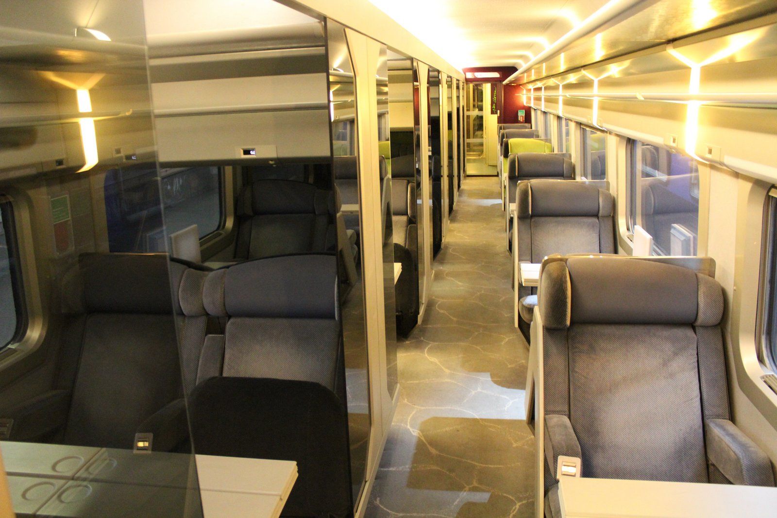 Foto´s: 1e en 3e foto tonen de 1e klas in een TGV trein, 2e foto is het barrijtuig, 4e foto toont de NS International lounche.