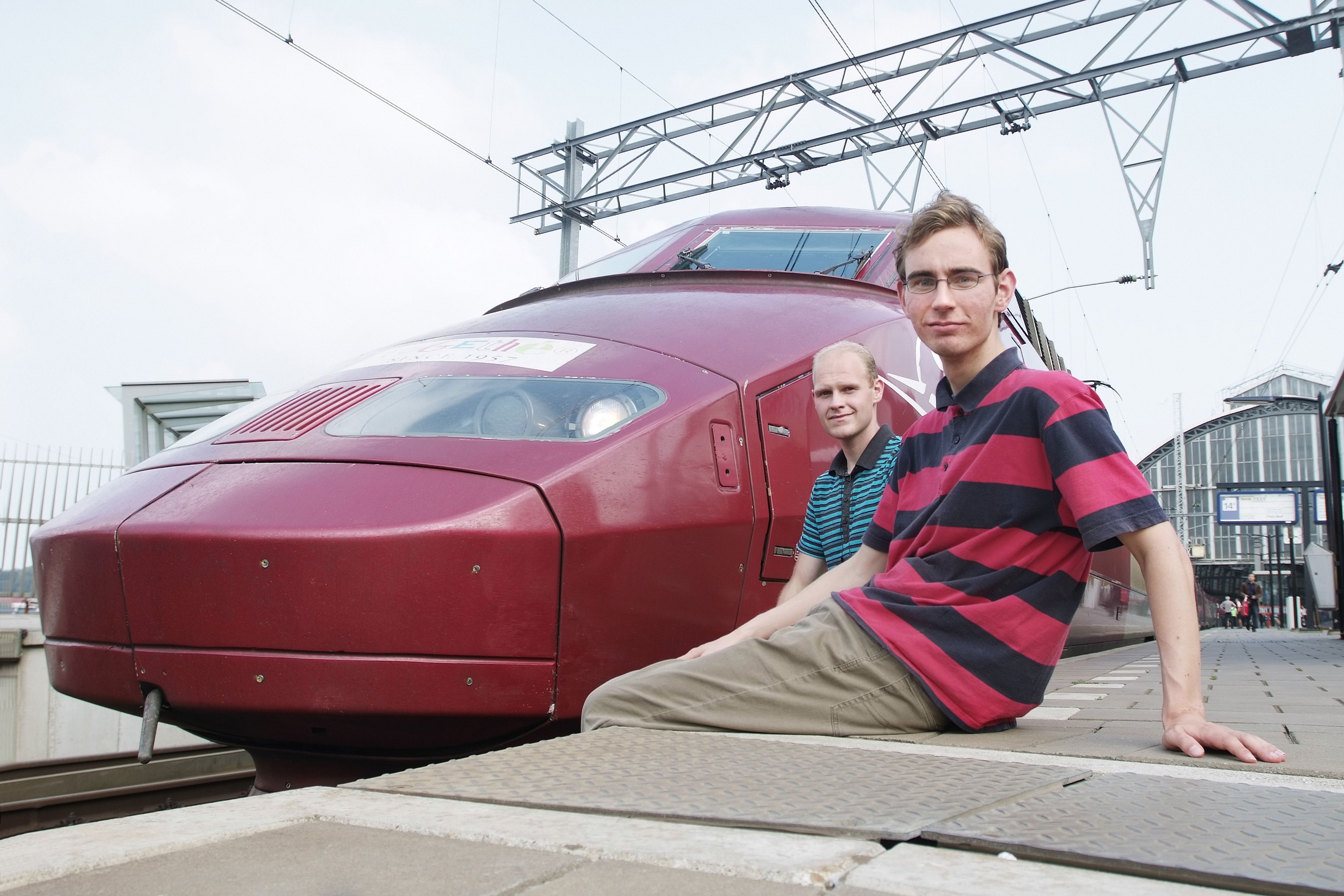 Foto: Hildebrand van Kuijeren en Mart Hopman bij een Thalys, na afloop van 25.000 kilometer treinen in éé´n week. (c) Fred van Diem.