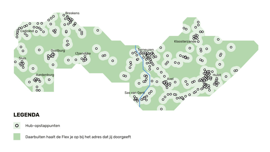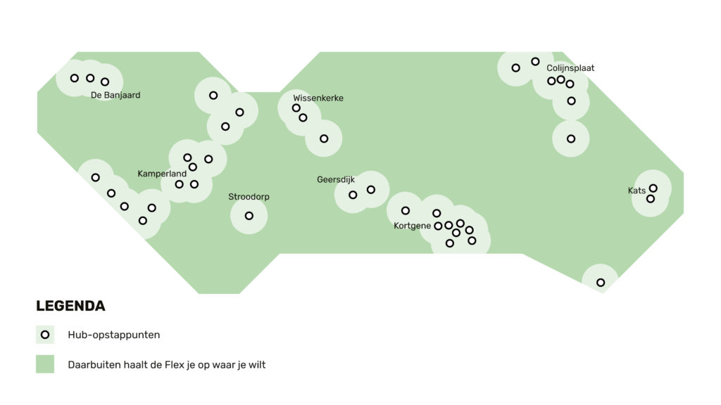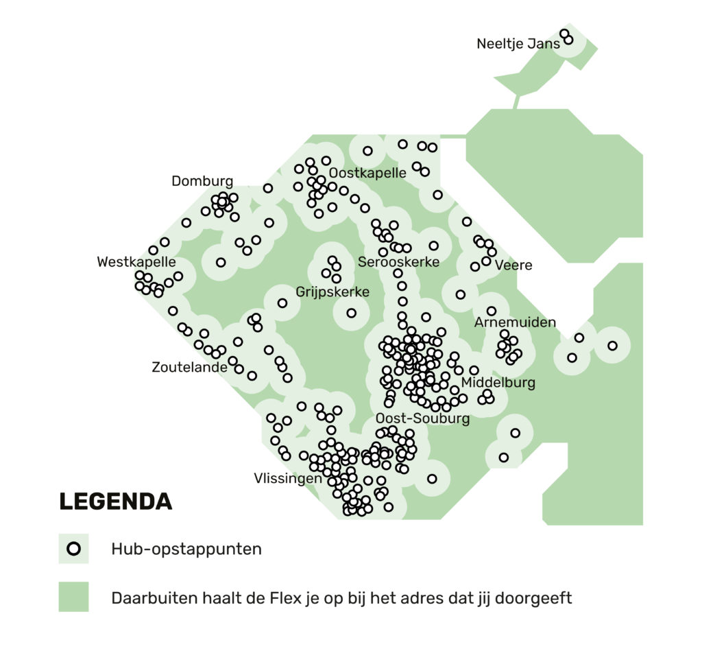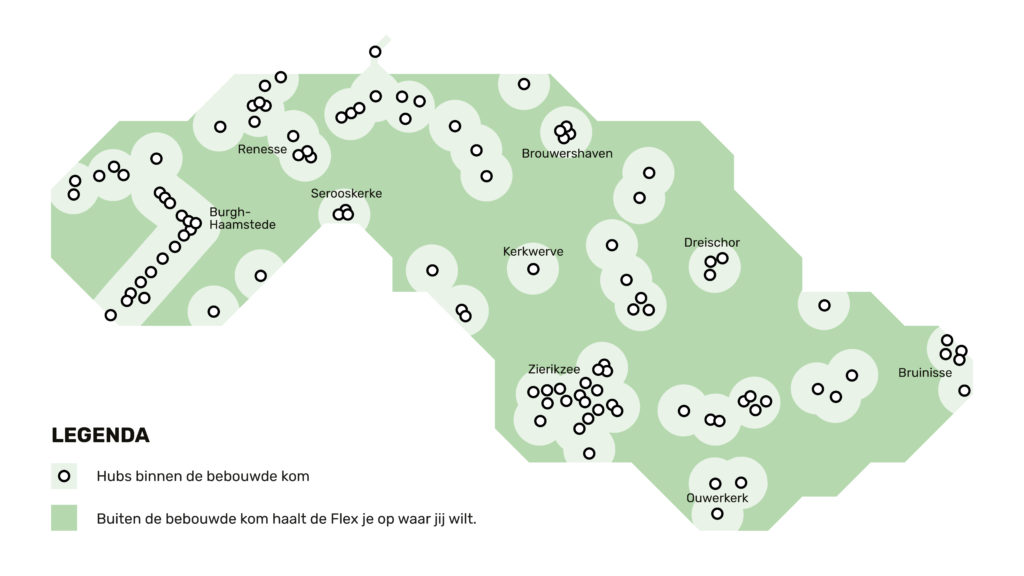 Zeeland Flex is zeven dagen per week beschikbaar van 06.00 uur tot 23.00 uur. Mensen kunnen reserveren via de Reizen door Zeeland of telefonisch (088 23 58 070) waarna de rit wordt ingepland. Doorgaans stappen mensen in- en uit bij een van de honderden haltes, hubs genoemd. In gemeenten is er voor de meeste mensen zo’n hub binnen 500 meter van huis.
