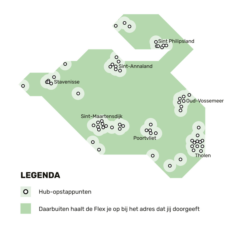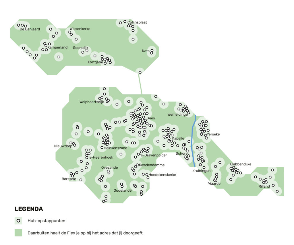In de buitengebieden, waar er geen hub in de buurt is, worden mensen op het (huis)adres opgehaald en gebracht. In sommige gevallen reizen mensen alleen in een taxi voor het reguliere ov-tarief, in andere gevallen zijn er meerdere mensen in een taxi of busje.