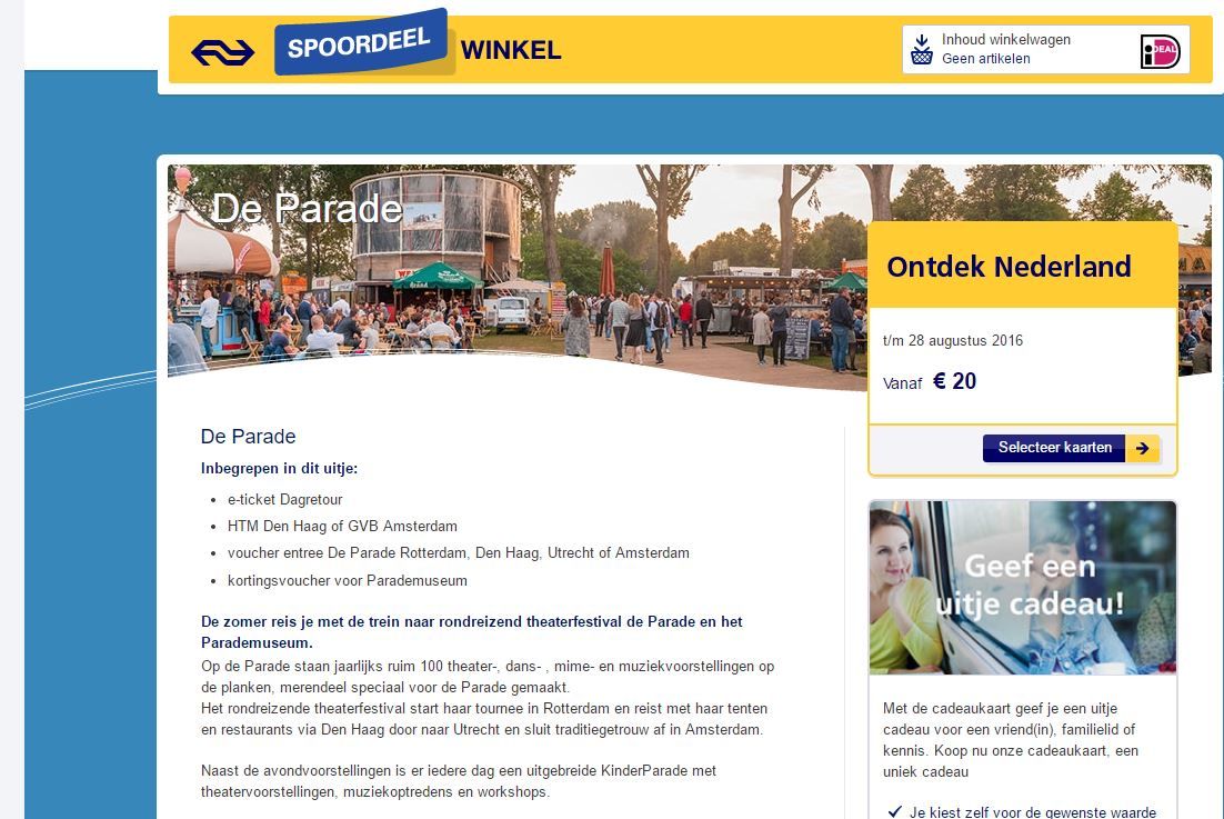De komende periode heeft NS een aantal speciale Zonnige Zomerspecials. Deze maand per trein bijvoorbeeld naar de Parade, dagje Zandvoort, nachtje Noordwijk and Share a Perfect Day in Tilburg. Dit zijn aanbiedingen, in aanvulling van het gebruikelijke aanbod van de Spoordeelwinkel van NS.